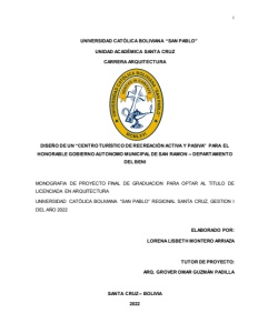 L16 PLANO DE: PERSPECTIVAS EXTERIORES TUTOR: ARQ. GROVER OMAR GUZMAN PADILLA POSTULANTE: LORENA LISBETH MONTERO ARRIAZA PROYECTO DE GRADO: DISEÑO DE UN CENTRO TURÍSTICO DE RECREACIÓN ACTIVA Y PASIVA PARA EL HONORABLE GOBIERNO AUTÓNOMO MUNICIPAL DE SAN RAMÓN - DEPARTAMENTO DEL BENI GESTION: 2022 -1 REFERENCIAS:
