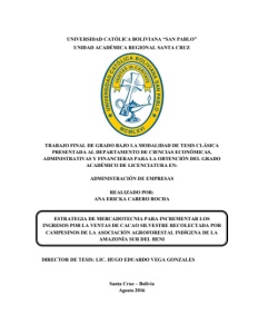 MARCO TEÓRICO 51 5.5 CULTIVO Y PRODUCCIÓN DEL CACAO El nombre científico que tiene el cacaotero o árbol que produce cacao es Theobroma cacao L. Theobroma es un género con 20 especies diferentes (entre ellas el cacao) y la palabra cacao proviene de “cacahuatl” que en el idioma nativo nahuatl (macrolengua azteca) significa literalmente “bebida de los dioses”. 120 Las flores del Theobroma cacao son pequeñas y de color rosado y se forman directamente en el tronco y ramas más antiguas. El fruto del cacao se forma en una baya alargada que mide entre 15 y 30 cm de largo y de 7 a 12 cm de ancho. Una vez madura pesa unos 450 gr y es de color marrón rojizo con áreas purpúreas y que se asemeja a un calabacín que se denomina mazorca o “maraca”, quizás por estar llena por dentro de semillas de las cuales se elabora el polvo de cacao. 121 La mazorca o maraca del cacao está formada por una corteza dura y rugosa y gruesa (unos 2 cm de espesor) la cual está por dentro llena de un tipo de pulpa dulzona y viscosa comestible que alberga entre 30 y 50 granos ubicados a modo de filas en un enrejado que forma la pulpa. Dichos granos se asemejan a las habas. Son carnosos, amargos y de color blanco con una envoltura fina rica en taninos. 122 Para que un árbol empiece a dar su producción de cacao han de trascurrir 4 o 5 años. Una vez el árbol ya produce, puede tener 6.000 flores, aunque de esas flores solamente madurarán 20 frutos. El Theobroma cacao da 2 cosechas las cuales necesitan de 5 a 6 meses entre la fertilización y la recolección del fruto. La cosecha que se considera 12 0 http://www.lineaysalud.com/nutricion/alimentos/chocolate-proceso-cacao, consultado el 24 de mayo del 2016. 12 1 http://www.lineaysalud.com/nutricion/alimentos/chocolate-proceso-cacao, consultado el 24 de mayo del 2016. 122 Ídem.