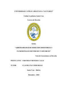 50 CAPÍTULO V ANÁLISIS NORMATIVO Con el fin de permitir el desarrollo y alcance general en los capítulos de la tesis, se ha desarrollado el siguiente análisis doctrinal y legal. 16 ANÁLISIS DOCTRINAL La interpretación del trabajo de investigación, a razón de proponer la regulación del arbitramiento en separación de bienes y su liquidación dentro de un divorcio contencioso, se la realiza en base a la teoría del matrimonio contrato, conforme a las aseveraciones siguiente. Para la doctrina del matrimonio como un contrato, el matrimonio es un acuerdo de voluntades entre dos personas que hacen surgir derechos y obligaciones entre ellas, en razón de sus teóricos se le ha considerado fundamentalmente como un contrato en el cual existen todos los elementos esenciales y de validez de dicho acto jurídico. Jiménez citando a Montero Duhalt, señala que el “matrimonio es forzosamente un contrato porque crea entre los conyugues derechos y obligaciones” (Pág. 82) 37 . Evidentemente la celebración del matrimonio, solo procede con la mediación de la voluntad de las partes con capacidad jurídica, así lo exige la legislación nacional, que invoca que los contrayentes a manifestar su consentimiento ante el Oficial Registro Civil para unirse en matrimonio, por lo que el elemento esencial es el acuerdo de las partes. En cuanto al régimen de bienes patrimoniales y la autonomía de la voluntad, para hacer efectiva la propuesta de llevar a cabo un proceso de separación de bienes gananciales a través del medio alternativo de resolución de conflicto como es el arbitraje, nos basamos 37 Jiménez Sanjinés, Raúl, Lecciones de Derecho de Familia y Derecho del Menor, UMSA, 2006, Pág. 82.