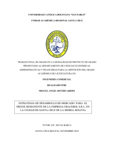 2 La empresa GRACEBOL S.R.L. inicia sus actividades en el año 2001. Nace como una empresa unipersonal. Fue puesta en marcha ya que existía una gran demanda en el tema de exportación y comercialización de frejoles. Está ubicada en el 7mo. Anillo en la zona del parque industrial con su oficina principal en Santa Cruz de la Sierra. Esta zona fue elegida debido a la alta concentración de fábricas y/o instituciones de diferentes rubros (Farel, 2018). Desde el comienzo, se contaba con galpones de amplios tamaños físicos, variedad de máquinas que se necesitan, desde que llega el producto (legumbres) hasta que es enviada a su destino final (Farel, 2018). Se empezó con la venta de gran variedad de frejoles, chía, sésamo y habas, actividad que se sigue realizando hasta hoy en día. Las exportaciones son debido a que varios países vecinos con los que se trabaja, tienen un déficit para satisfacer la necesidad de consumo de entre producto. Las ventas se realizan a empresas importadoras (Farel, 2018). La empresa cuenta con 40 trabajadores aproximadamente bajo contrato y una cantidad que varía por las estaciones, adicionalmente cuenta con trabajadores de ocasión ya que, al tratarse de granos, la intensidad de trabajo varía de acuerdo a las estaciones del año (Farel, 2018). La empresa GRACEBOL S.R.L. se dedica al acopio y comercialización de granos, como ser: frejol, sésamo, haba y chía. GRACEBOL se dedica especialmente a la venta y exportación de frejol, debido a que tiene diez variedades para exportar, las cuales son: rojo oriental, negro, blanquillo, alubia blanca, alubia fabada, cuarentón, mungo, dark, carioca y cambita. El sésamo, haba y chía son granos de exportación, pero no son de mayor cantidad, debido a que su adquisición a los países que se suele exportar no es a gran escala a comparación del frejol. GRACEBOL, como empresa procesadora de granos, a la hora de realizar la preparación y selección del producto designa el frejol de mejor calidad para la exportación, dejando siempre un porcentaje que no puede ser puesto a la venta para el exterior debido a que no cumple con el estándar requerido. Este porcentaje oscila entre un 18% al 15% (porcentaje en la empresa GRACEBOL) el cual no tiene un mercado meta y por ende representa pérdida para la empresa