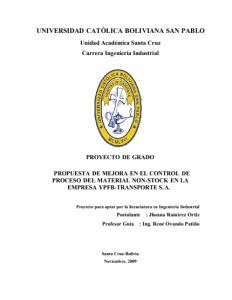Universidad Católica Boliviana “San Pablo” Capitulo VI Jhoana Ramirez Ortiz - 93 - Cuadro. 6.8: Registro Planilla de Salidas PLANILLA DE SALIDAS Gestión ……… Nro Despachante Fecha Ítem Destino Descripción (Ítem de O.C.) Orden de Compra LN-FN Ítem de O.C. Importancia Fuente: Elaboración propia Cuadro. 6.9: Planilla de Devoluciones PLANILLA DEVOLUCIONES GESTION……. No. Devolución Fecha Recepción Origen Responsable de Entrega Compañía Item Descripción Condición de Material (1-2-3-4) No Reingreso al JDE Ubicación Actual Fuente: Elaboración propia