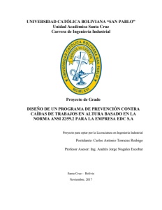 UNIVERSIDAD CATÓLICA BOLIVIANA “SAN PABLO” PROGRAMA DE PREVENCIÓN CONTRA CAÍDAS DE TRABAJO EN ALTURAS Carlos Antonio Terrazas Rodrigo 87 Fuente: Norma OSHA 1910.23 requisitos mínimos para escaleras fijas. La norma nacional no estable las medidas necesarias para escaleras las cuales pasan a través de una abertura. Para propósitos de estandarización de medidas de seguridad se tomaran en cuenta las medidas establecidas por la norma OSHA 1910.23 como también se puede apreciar en la figura 6.15 Figura 6. 15: Medidas para escaleras que atraviesan aberturas. Fuente: Norma OSHA 1910.23 requisitos mínimos para escaleras fijas que atraviesan aberturas 6.6.2. Andamios El armado y desarmado de un andamio se debe realizar bajo las siguientes consideraciones: (Como se establece en la norma NTS 005/17) • Se debe transportar los elementos de construcción, crucetas, diagonales, barandas, escaleras, marcos, pernos, tablones, plataformas, tacos, entre otros y la señalización adecuada al lugar de trabajo con la debida autorización (permiso de trabajo). • El piso donde se armará el andamio de trabajo será nivelado y firme. Un andamio no debe ser colocado sobre tierra, fango, césped, grava, o superficies irregulares. En