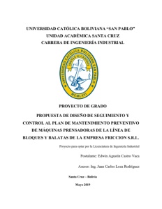 Universidad Católica Boliviana “San Pablo” Propuesta de mejora 72 Edwin Agustín Castro Vaca 5.7. PROCEDIMIENTO DEL DISEÑO DE SEGUIMIENTO Y CONTROL Paso 1º El planificador de mantenimiento ingresará a la planilla donde primeramente podrá observar un cuadro con botones vinculados a cada ventana con el nombre correspondiente de cada uno de los puntos. (Figura 5.7 Programa de mantenimiento) Paso 2º El planificador ingresara a la hoja denominada Plan de mantenimiento anual y buscar la semana designada en la cual se deben ejecutar todas las tareas preventivas a los distintos equipos en este caso las máquinas prensadoras PR-PRE-01 , PR-PRE-02,PR-PRE- 05 y PR-PRE-10.(Figura 5.8 plan de mantenimiento anual) Paso 3º Al momento de obtener las ordenes se sabrá cuáles son las actividades que se ejecutaran durante la semana correspondiente; copiara todas las actividades y las pegara en la hoja denominada “PROGRAMA”; donde incluirá la fecha de inicio y final de la semana que corresponda y finalice la tarea , se enviara el documento al jefe de mantenimiento con sus respectivas ordenes de trabajo para entregarlas a todo el personal de mantenimiento que ejecutara las tareas preventivas correspondientes a cada equipo en este caso las máquinas prensadoras.(Figura 5.9 Programa de mantenimiento semanal) Paso 4º Una vez obtenido los datos con éxito de los documentos y con las ordenes de trabajo entregadas por el personal de mantenimiento al finalizar la semana, el jefe de mantenimiento procederá a ingresar el índice de cumplimiento de cada actividad dada durante la semana, las causas por las cuales no se generaron algunas actividades ya sea porque no se llegaron a parar los equipos y las horas reales que se generó al ejecutar cada actividad preventiva a las distintas prensas(Figura 5.10 Programa de mantenimiento semanal) Paso 5º Recibida la planilla por parte del jefe de mantenimiento;el planificador observara las tareas cuales se cumplieron y cuales se deben de reprogramar. (Figura 5.11Tareas a reprogramar)