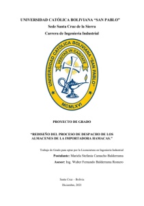 Universidad Católica Boliviana “San Pablo” Propuesta de mejora 52 5.1 Introducción De acuerdo a la recopilación de información y el análisis realizado en el capítulo de diagnóstico, se demostraron los principales problemas que afectan al sistema de gestión de almacenes, provocando incurrir un costo alto para la Importadora. Por lo tanto, de acuerdo a los objetivos planteados, se elaboran las presentes propuestas que serán abordadas en el presente capitulo y se resumen en el siguiente Cuadro 5.1. Cuadro 5. 1 Propuestas Elaboradas Fuente: Elaboración en base a lo desarrollado a lo largo del capítulo. 5.2 Desarrollo de la propuesta 5.2.1 Propuesta de metodología para la ubicación El método actual que utilizan en el almacén, para organizar los productos ya sea en los Racks o a nivel piso, está dado por poner los productos en algún campo de almacenamiento que este desocupado, no respetan como se decía anteriormente un nivel de rotación de los productos que salen en gran cantidad del almacén. Como método preventivo respecto a la situación actual, se propone capacitar al personal para organizar mejor los productos en el almacén, y así sea más fácil buscarlos al momento de realizar el picking con la documentación respectiva. Se empleará el método de Clasificación ABC para poder identificar y ubicar estratégicamente los productos según su demanda y niveles de rotación. Cabe mencionar que este método toma en consideración aquellos productos con mayor demanda y/o rotación y los ubica en lugares que están más próximos a las zonas de despacho; lo propio se hace con los productos que tienen una demanda media y finalmente aquellos productos que son de poca demanda, los ubica en zonas relativamente alejadas de la zona de despacho. Propuesta Acciones Mejora en la Gestion de Almacenes Mejoras en gestion de inventarios, mediante la identificacion y clasificacion de los productos, clasificacion ABC de los productos. Capacitacion al personal operativo sobre la nueva forma de ordenamiento. Mejora en los procedimientos Definir los documentos esenciales para que el personal operativo pueda realizar sus funciones de una manera optima y ordenada. Ventanas Horarias Implementación de una política que para una mejor organización en las cargas y recargas que se realizan en almacén.